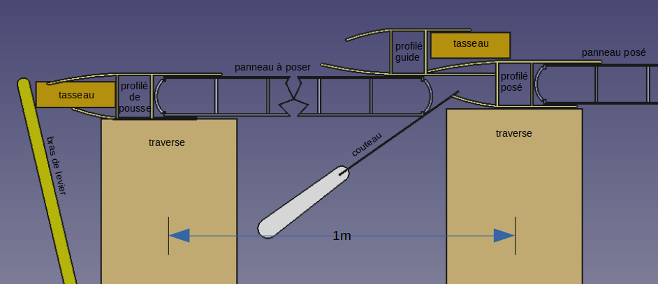 Les profilés de polycarbonate se referment sur les bords, et rendent l’assemblage avec les px extrêmement compliqué. J’ai dû faire preuve d’imagination en bricolant au montage, un rail d’assemblage (v. dessin) et en confectionnant un bras de levier pour pousser le px tout en, à l’aide d’un couteau de plâtrier ouvrant la gorge du profilé.