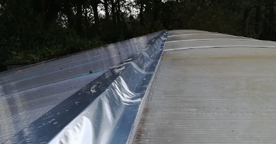Ce 19 nov., j’ai recoupé les parties débordantes des panneaux au niveau de faîtage, réduisant la prise au vent, puis j’ai collé sur toute la longueur (12m) un ruban d’étanchéité autocollant, faisant la liaison entre les panneaux.