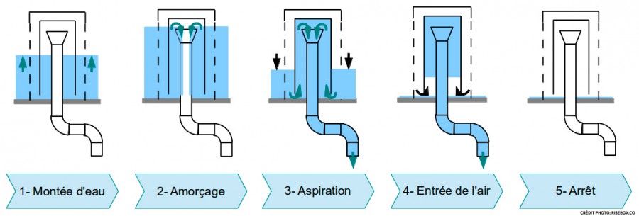 Notez que les 2 coudes du bas, sont importants, ils permettent de favoriser l'amorçage du siphon. Un petit étranglement à ce niveau va en faciliter le fonctionnement.
