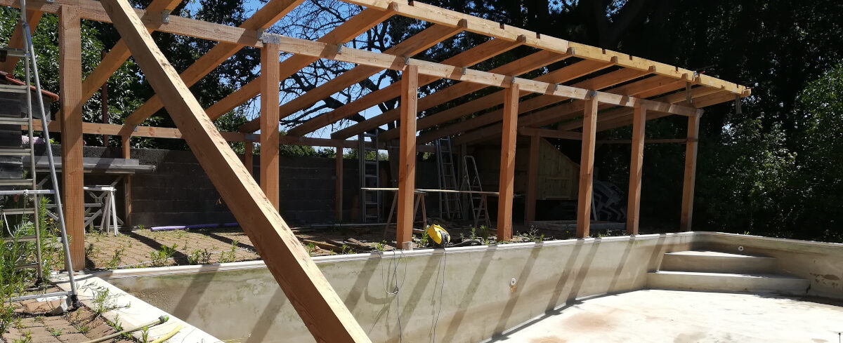Ma 1ère décision est de relever les panneaux à 2m80 de manière permanente et face au sud, en les appuyant sur une structure de bois. Cette structure va couvrir l’ensemble de la plage entourant la piscine.