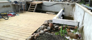 Je réalise dans les 2/3 de la partie la plus profonde un muret de 100cm, qui va délimiter un bac d’un total de 6m3 pour la plantation des arbres.